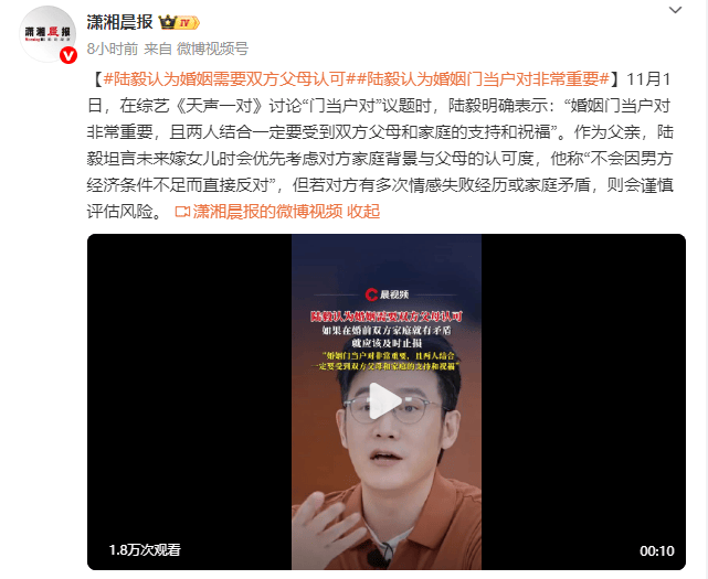 11月1日,在综艺《天声一对》讨论“门当户对”议题时,陆毅明确表示:“婚姻门当户对非常重要,且两人结合一定要受到双方父母和家庭的支持和祝福”。作为父亲,陆毅坦言未来嫁女儿时会优先考虑对方家庭背景与父母的认可度,他称“不会因男方经济条件不足而直接反对”,但若对方有多次情感失败经历或家庭矛盾,则会谨慎评估风险。